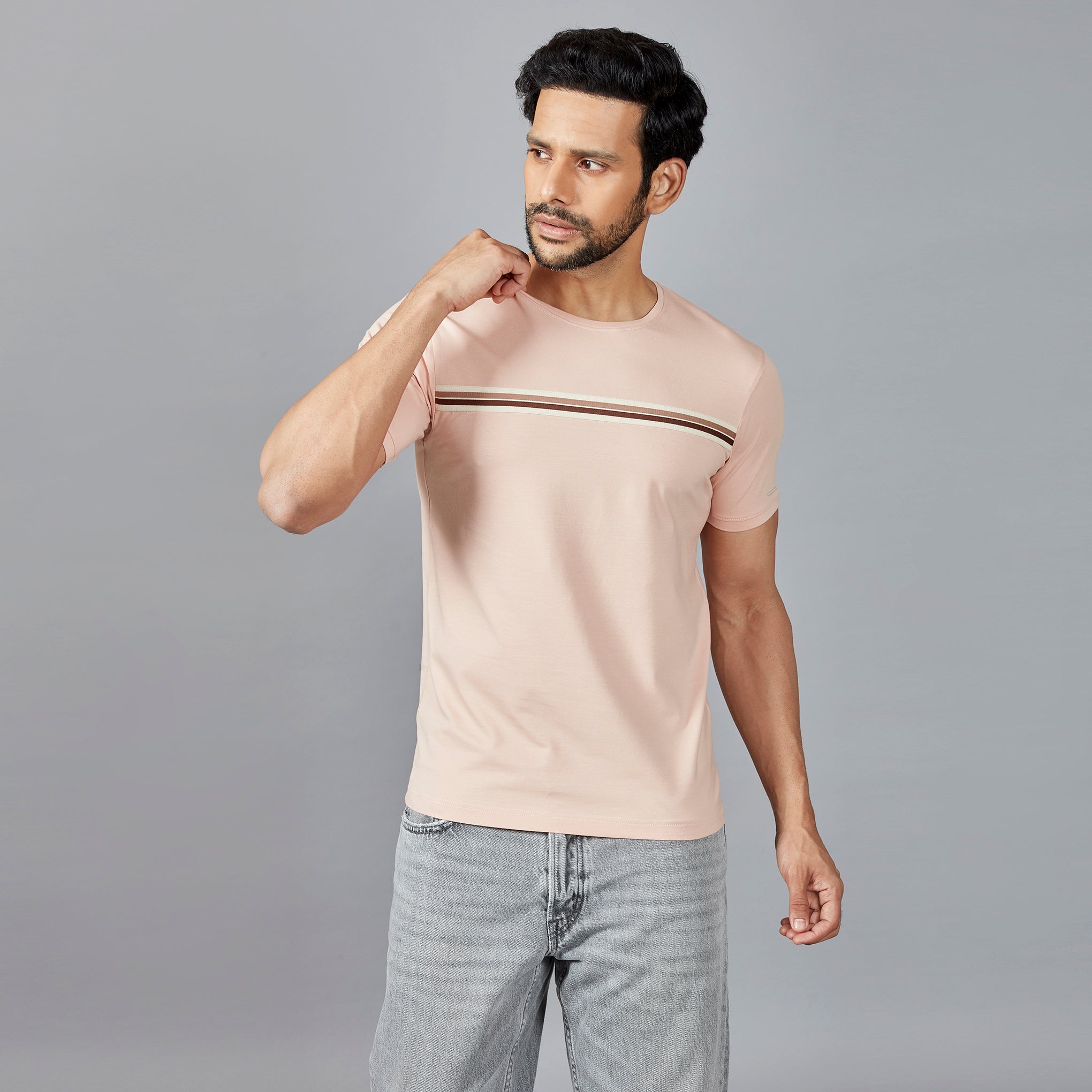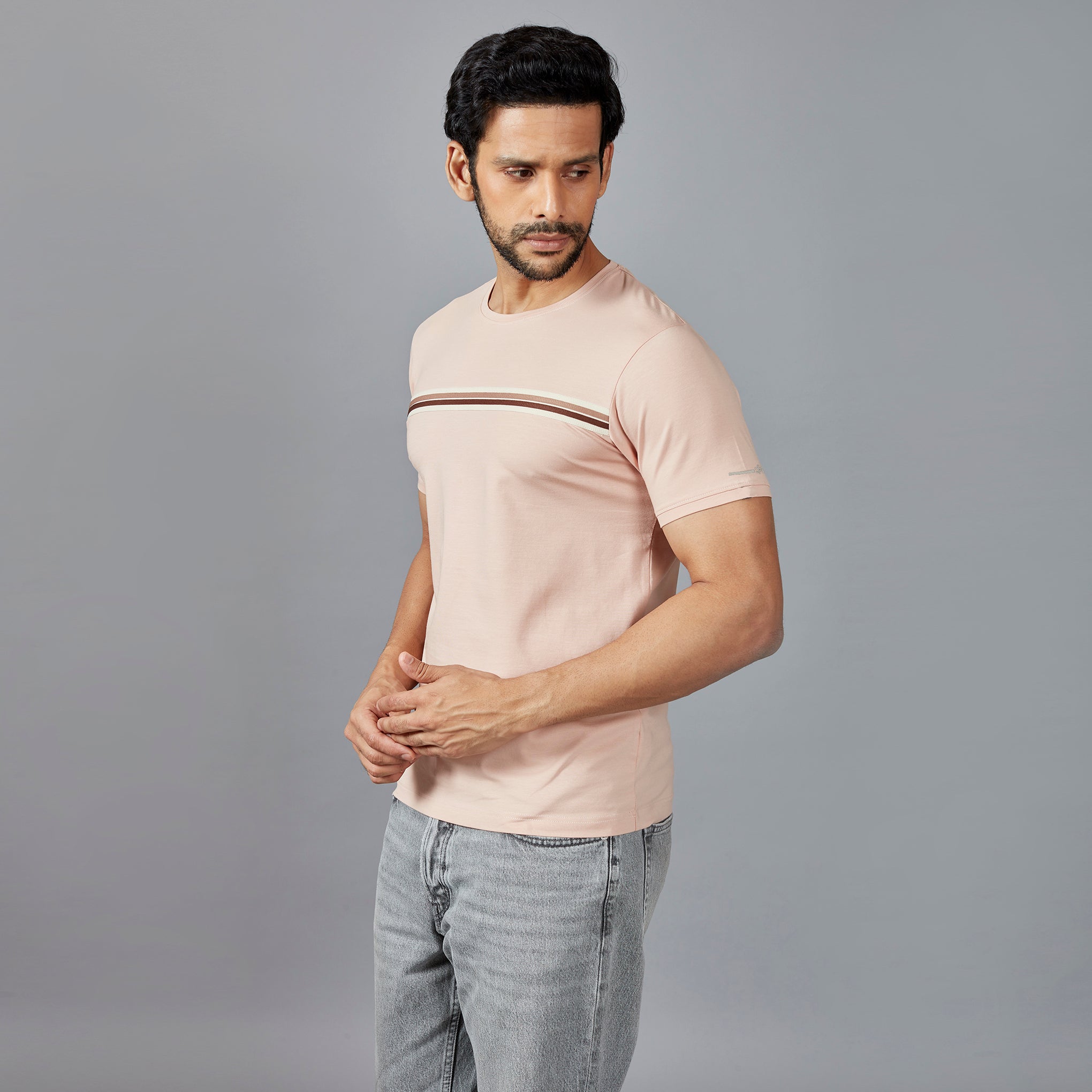 T-shirt featuring a sleek and contemporary design Flat Knit Panel Stripes adorning the chest. Elevate your casual style with this modern twist on a classic wardrobe staple Perfect for warm weather or layering during cooler days, the half sleeves provide versatility to adapt to different seasons