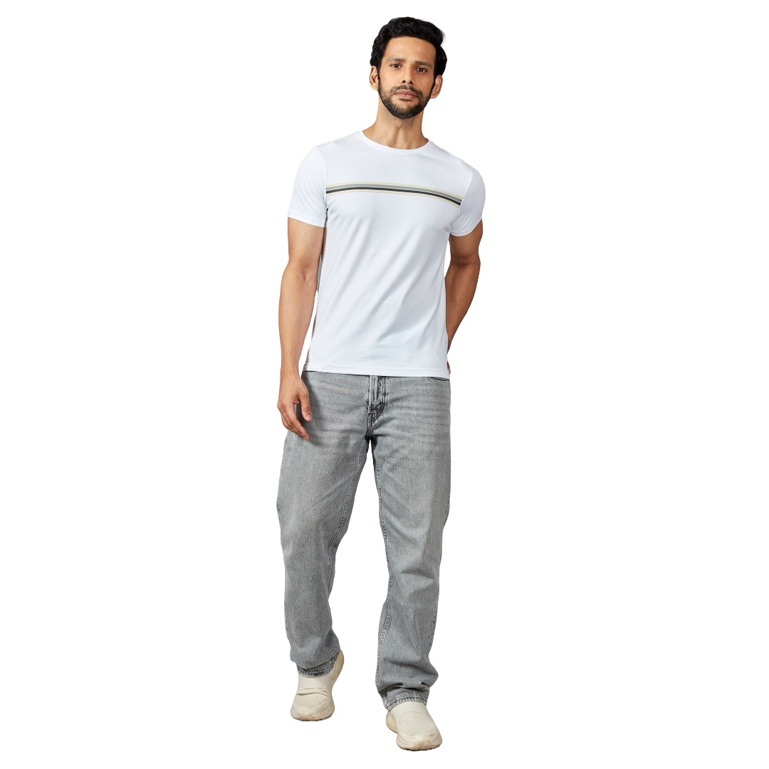 T-shirt featuring a sleek and contemporary design Flat Knit Panel Stripes adorning the chest. Elevate your casual style with this modern twist on a classic wardrobe staple Perfect for warm weather or layering during cooler days, the half sleeves provide versatility to adapt to different seasons