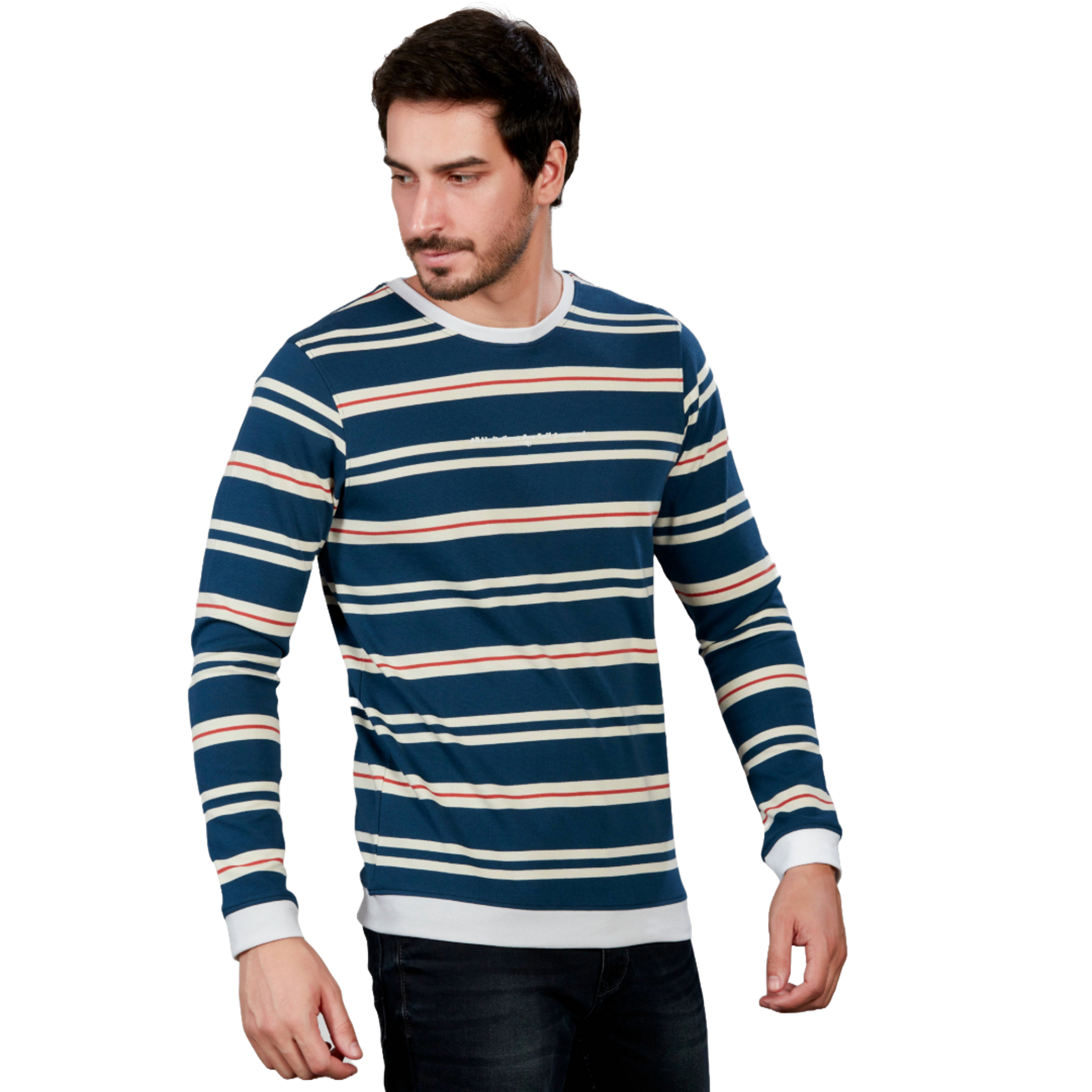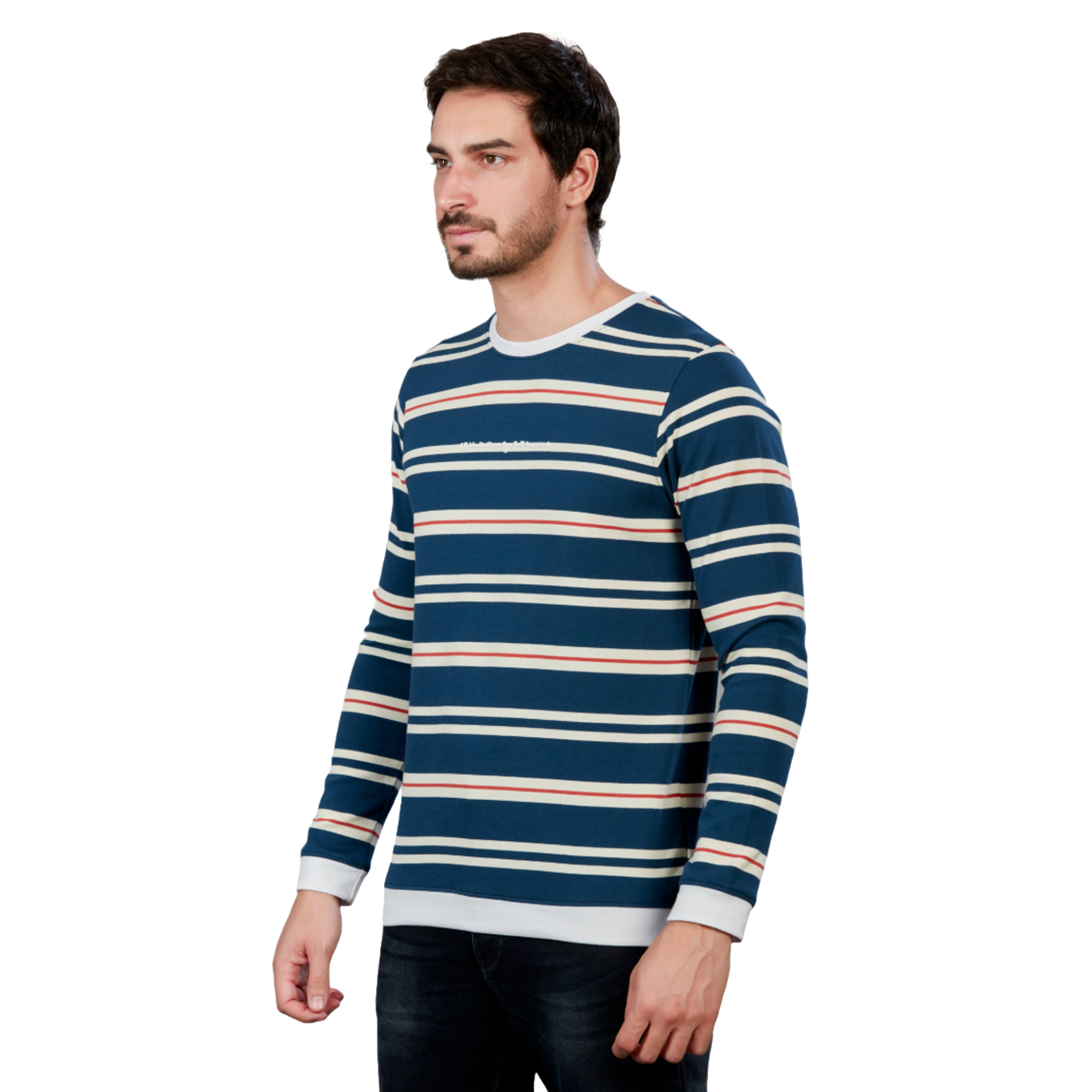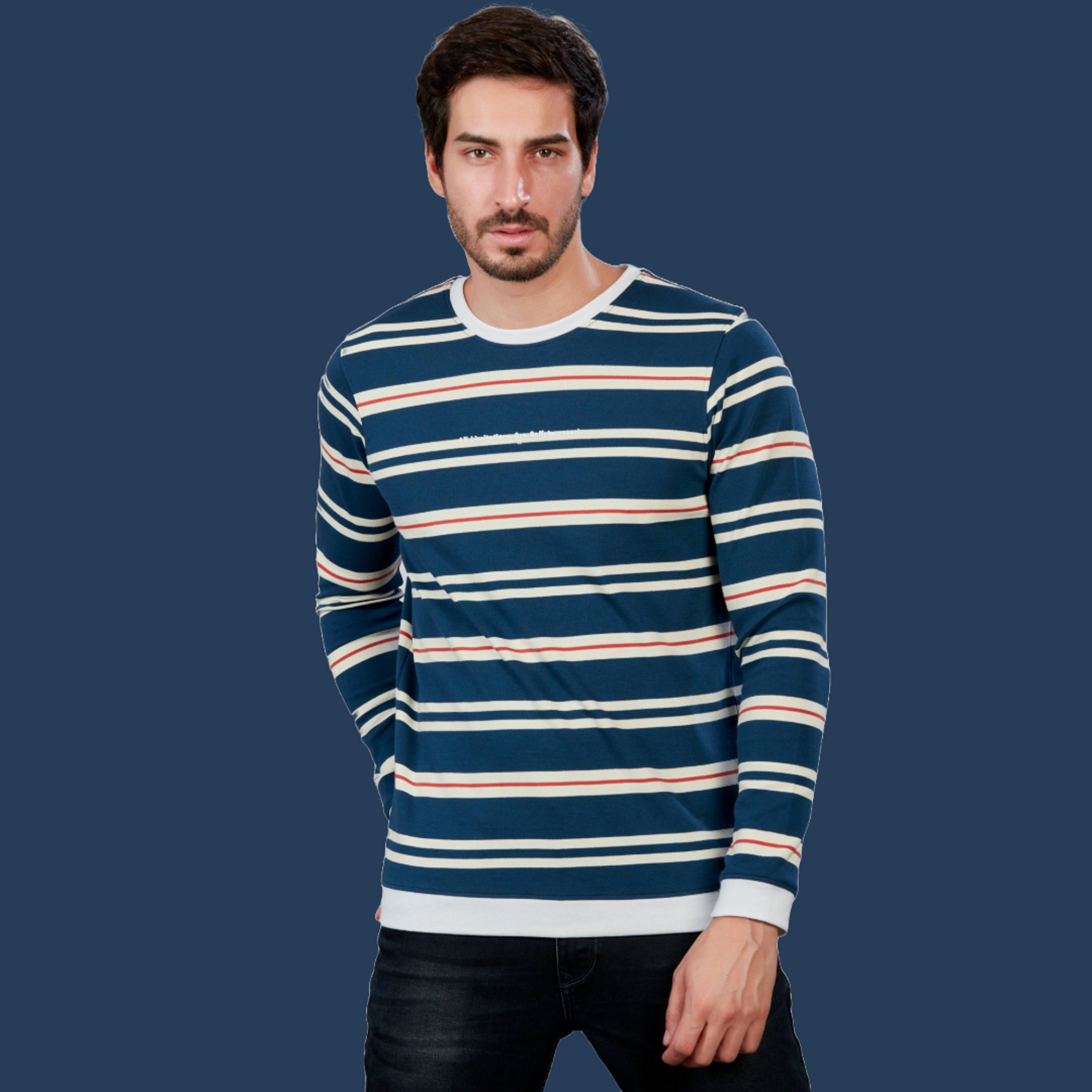 his stylish Striped Round Neck  full sleeve T-shirt combines timeless design with modern comfort. , it offers a soft and breathable feel against the skin. The classic round neck and full sleeves provide a versatile look suitable for various occasions.  Whether worn casually or dressed up, this T-shirt effortlessly elevates any ensemble with its combination of comfort, style, and versatility.