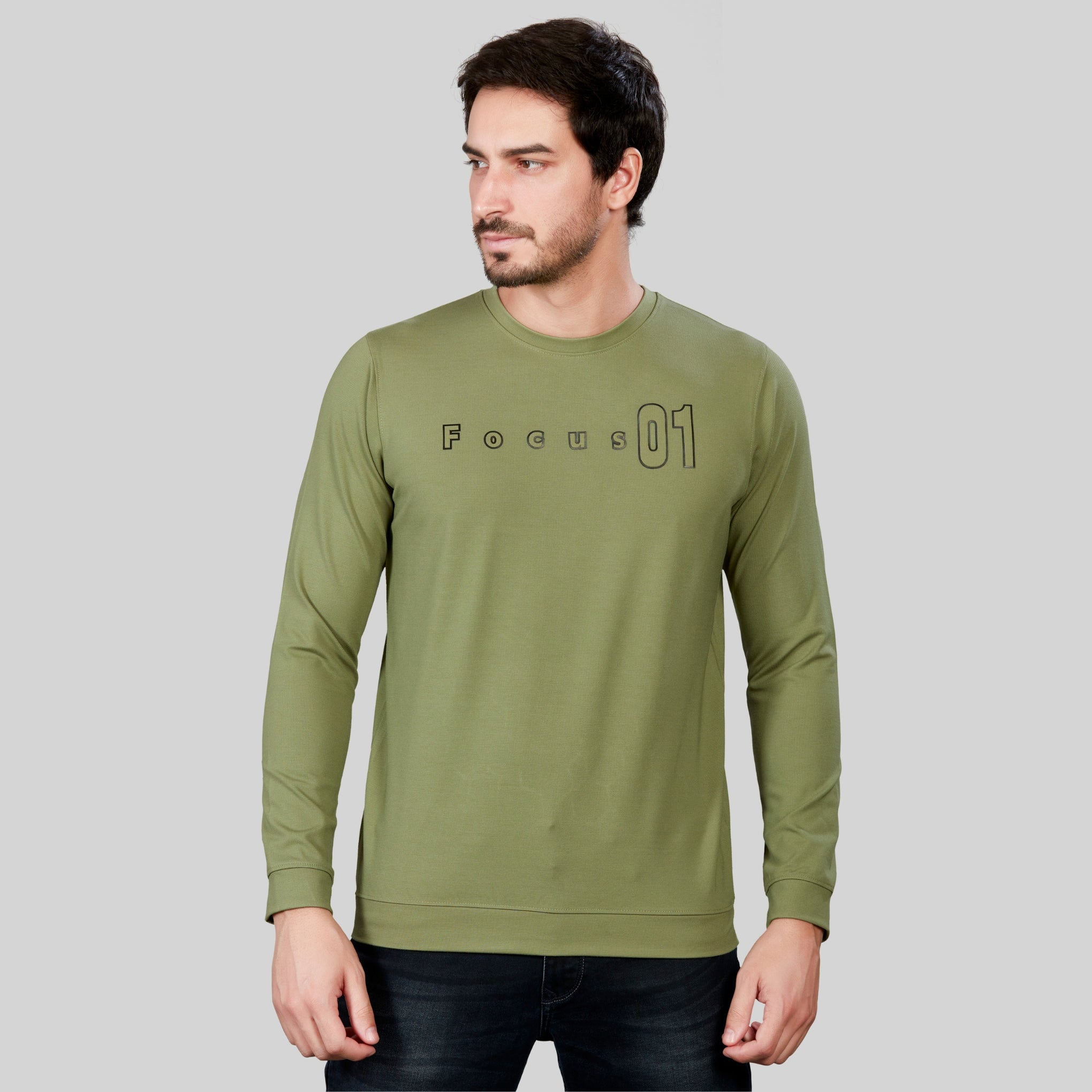 The "Focus Print" showcases intricate details and bold imagery, serving as a reminder to stay centered and determined in pursuit of your goals. Whether it's a striking focal point or a motivational mantra, this print embodies the essence of focus and determination. Full Sleeve olive green t Shirt.