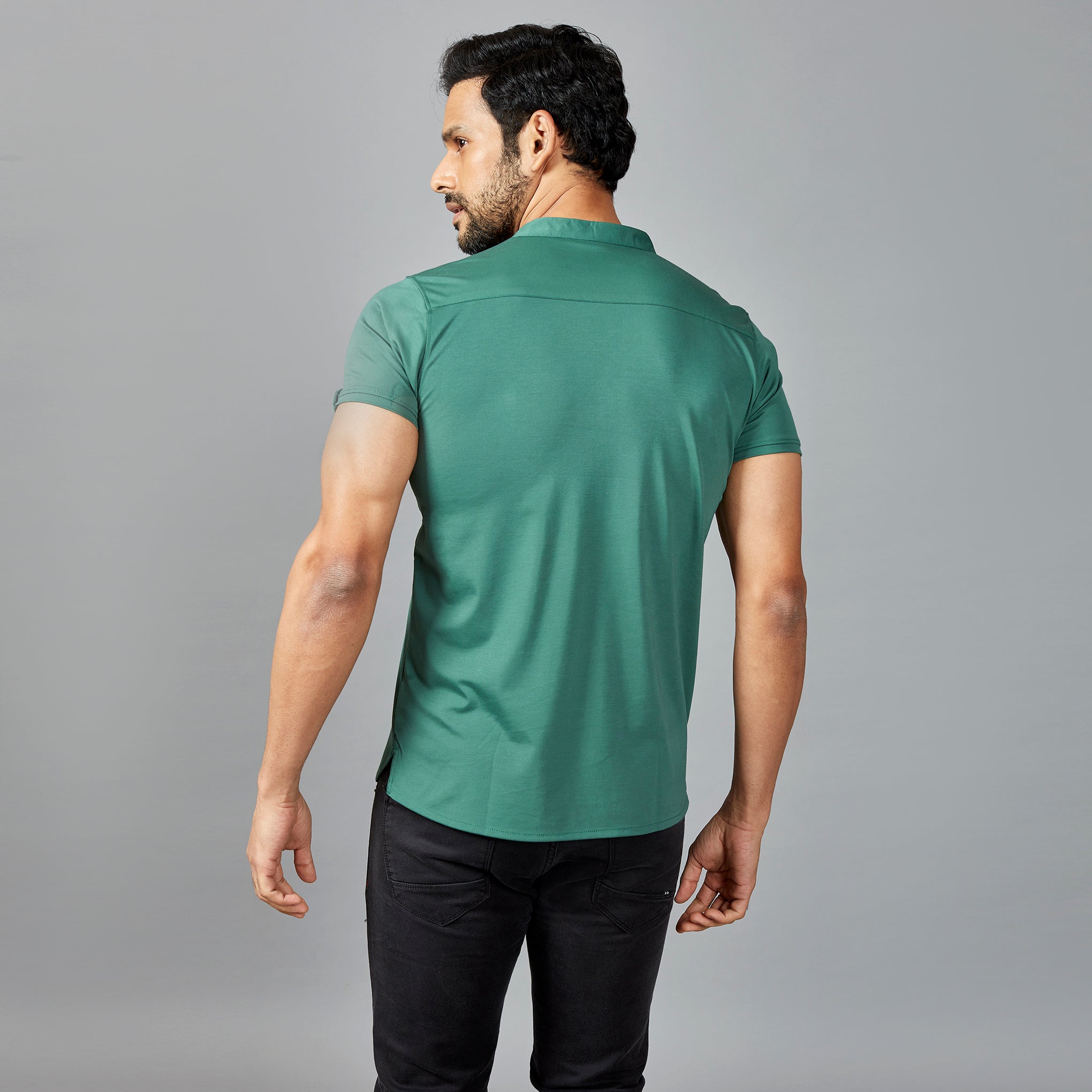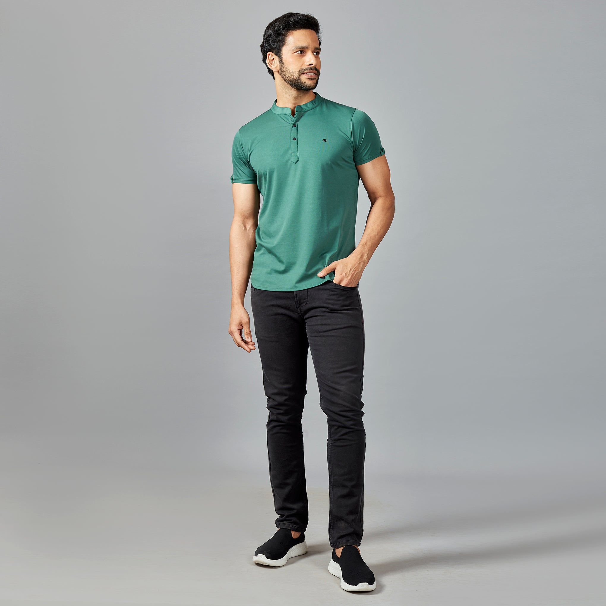 Henley T-shirt–A fusion of timeless style that effortlessly elevates your casual wardrobe The Henley neckline adds a touch of sophistication and versatility to your casual ensemble. The military inspired details –the epaulettes on the cuffs provide a distinctive and fashion-forward edge to the traditional T-shirt bottle green.