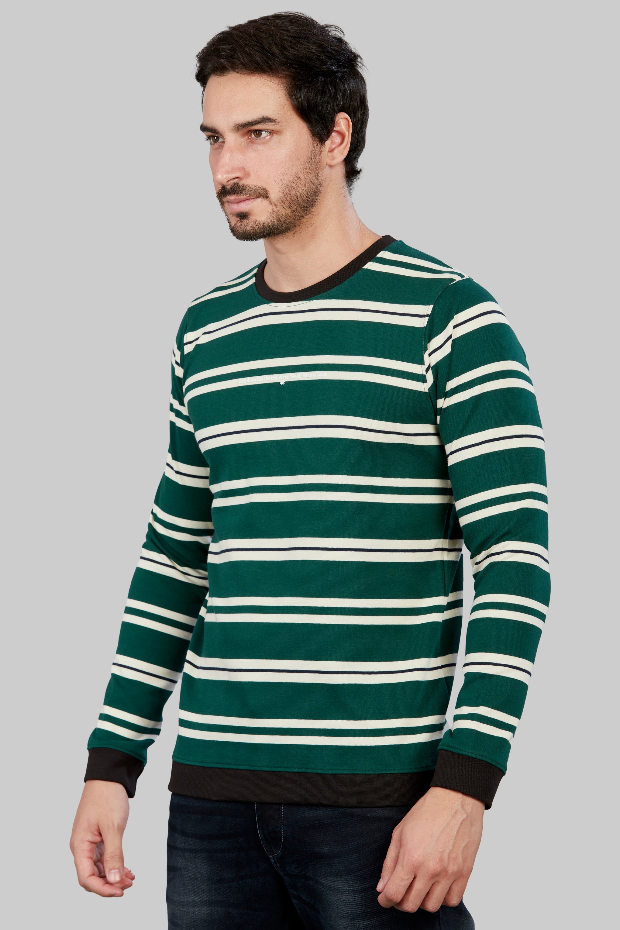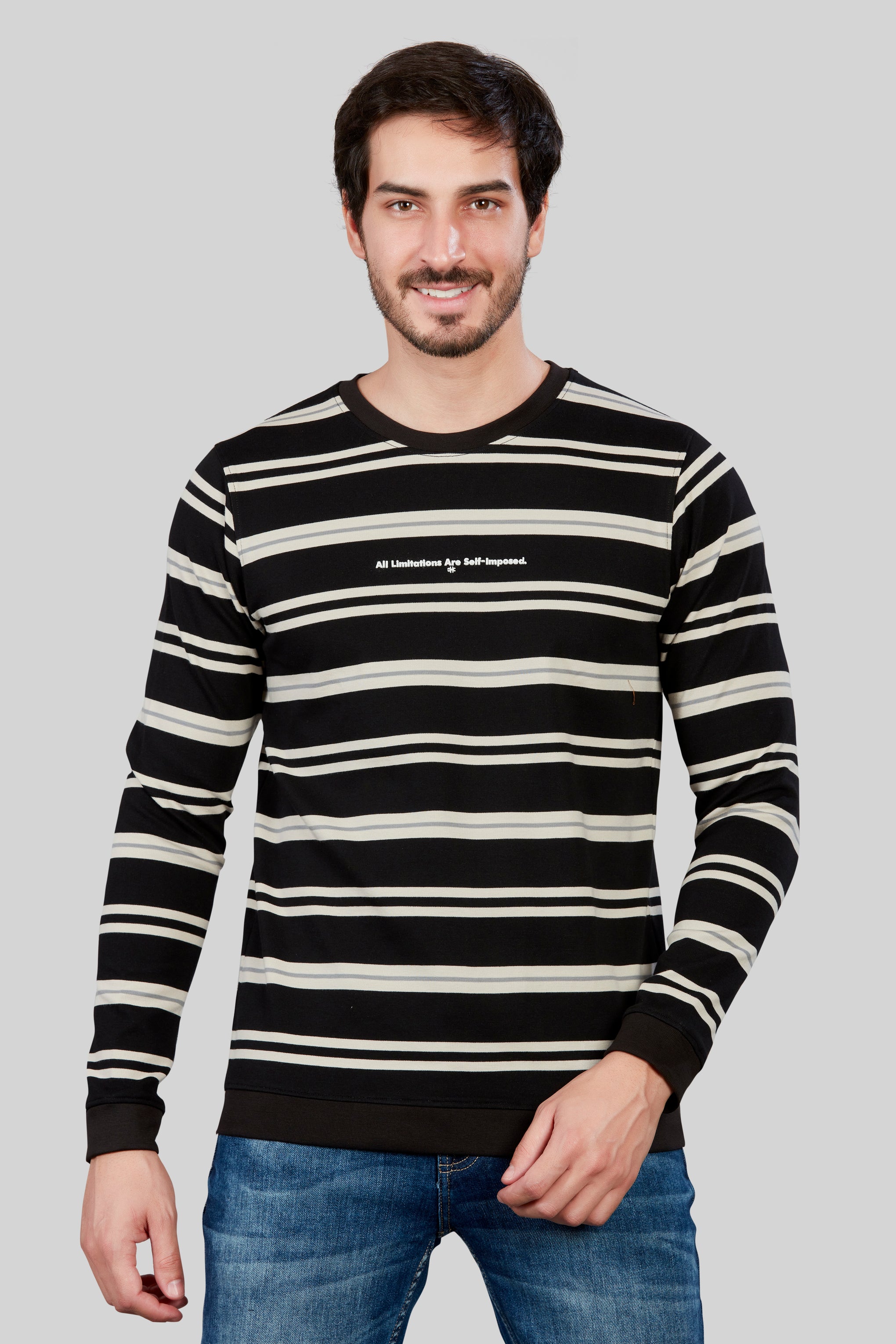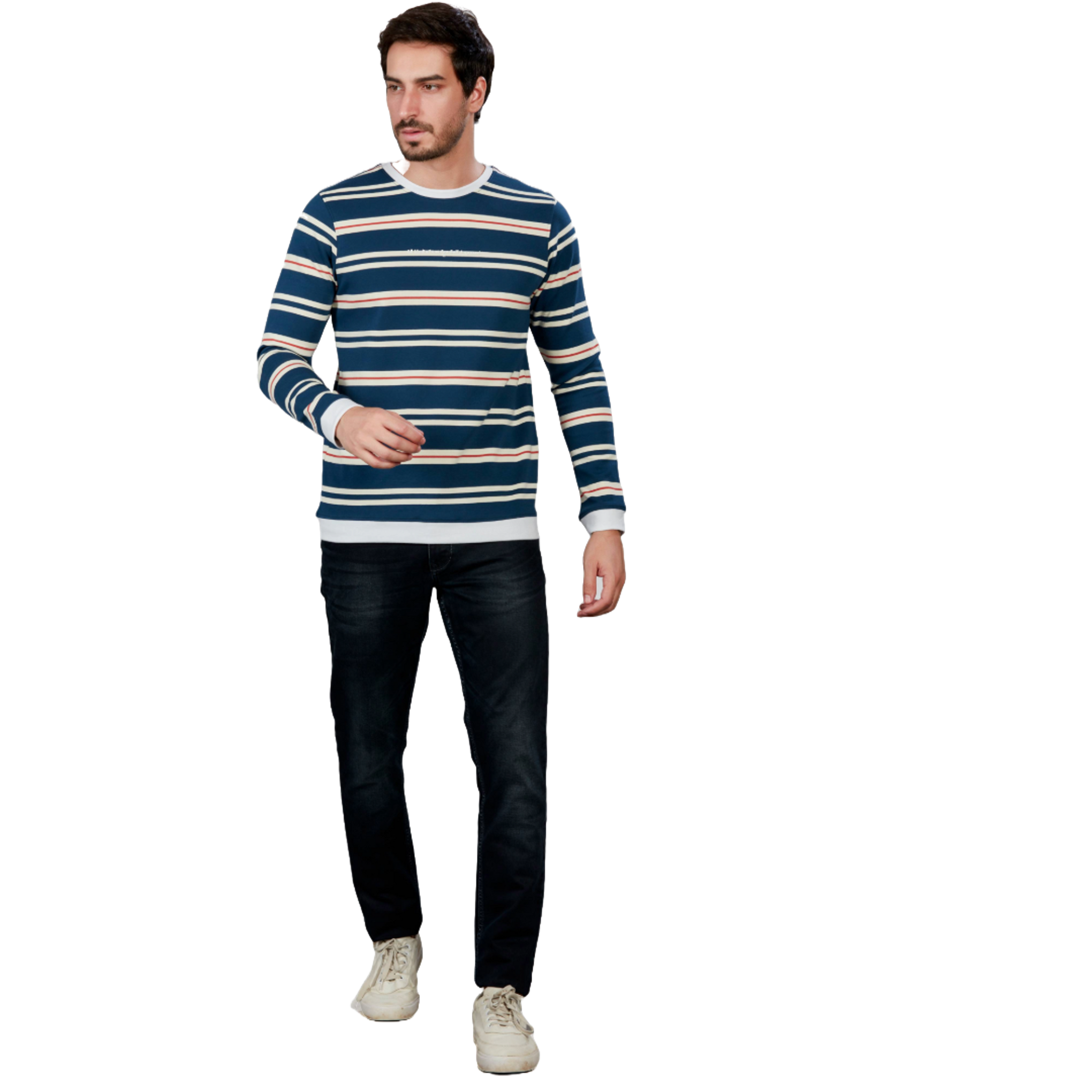 his stylish Striped Round Neck  full sleeve T-shirt combines timeless design with modern comfort. , it offers a soft and breathable feel against the skin. The classic round neck and full sleeves provide a versatile look suitable for various occasions.  Whether worn casually or dressed up, this T-shirt effortlessly elevates any ensemble with its combination of comfort, style, and versatility. Full sleeve cotton t shirts for mens.