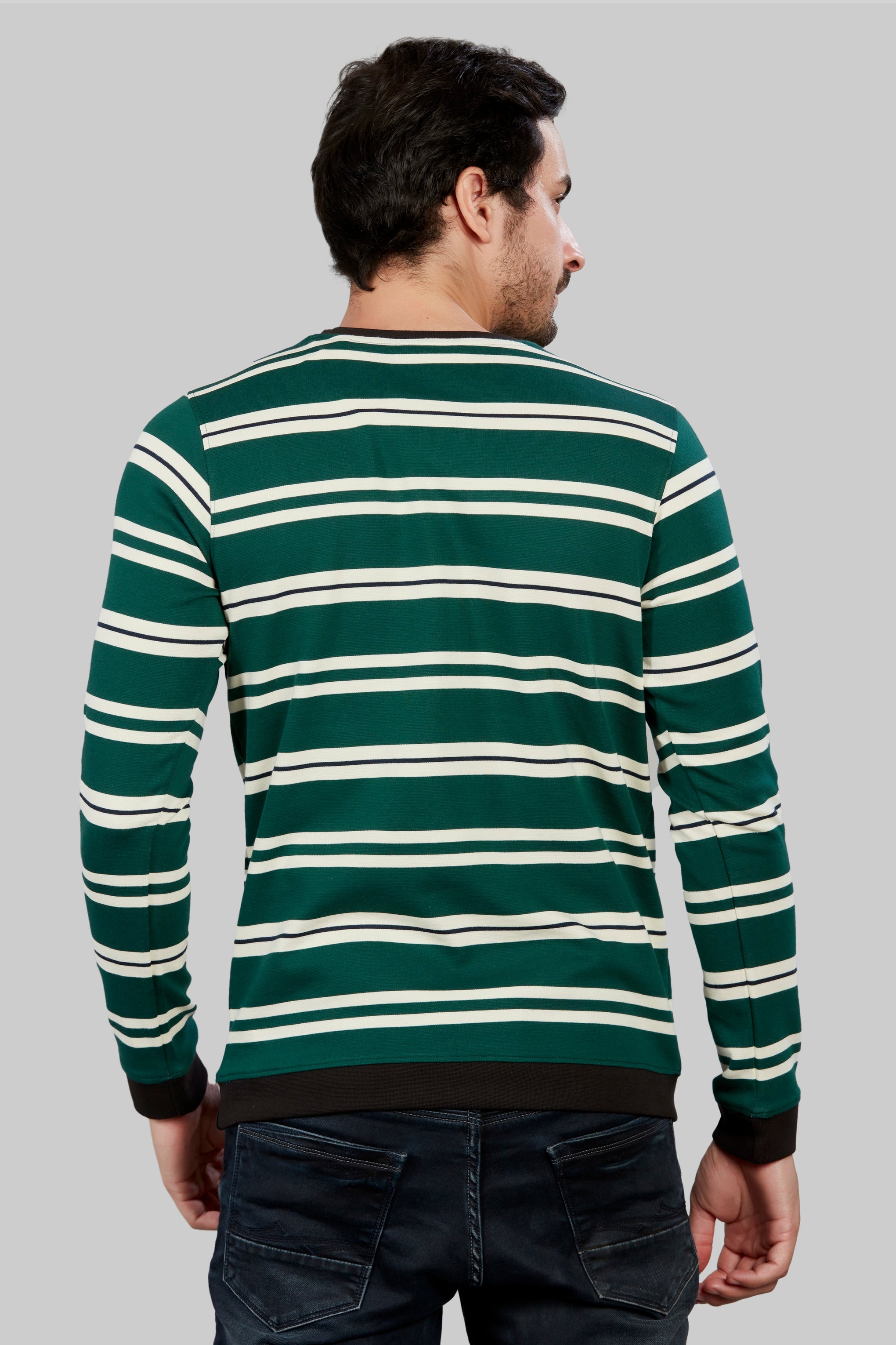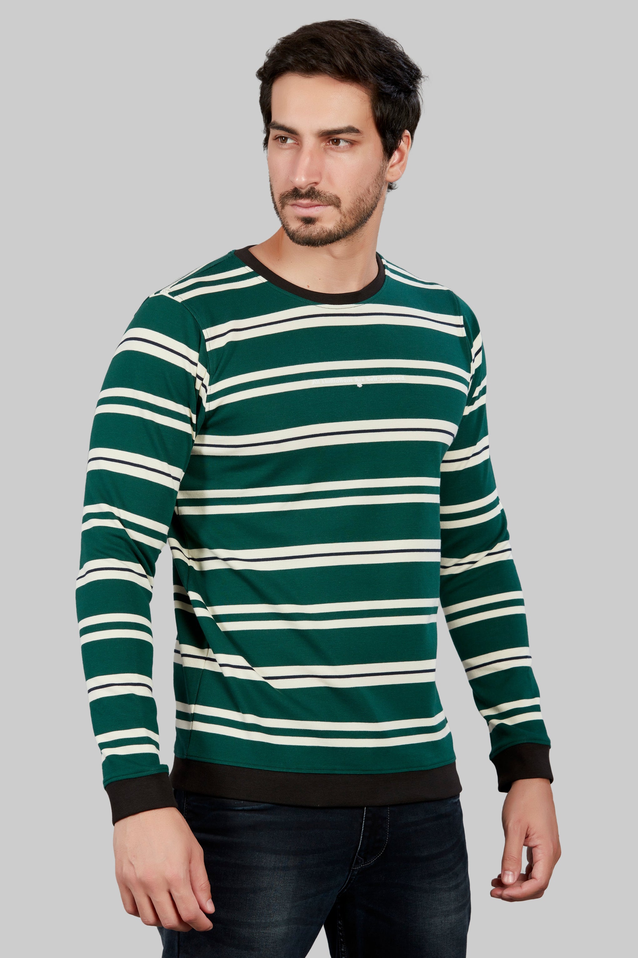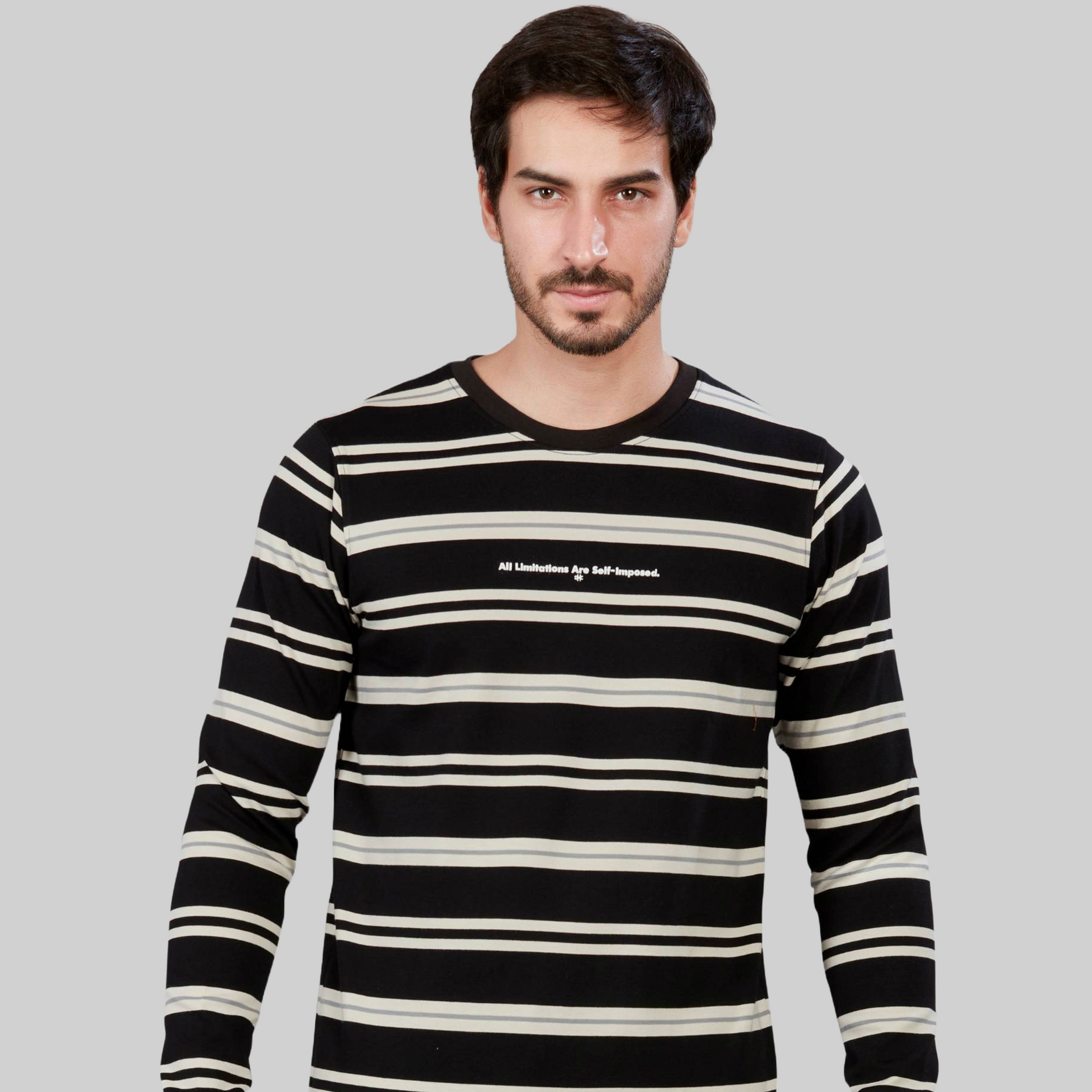 his stylish Striped Round Neck  full sleeve T-shirt combines timeless design with modern comfort. , it offers a soft and breathable feel against the skin. The classic round neck and full sleeves provide a versatile look suitable for various occasions.  Whether worn casually or dressed up, this T-shirt effortlessly elevates any ensemble with its combination of comfort, style, and versatility. Full sleeve cotton t shirts for mens.